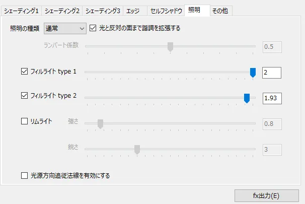 照明はランバートだとちょっと顔が怖くなりがちだったので通常に。フィルライトはレフ板みたいなもので、顔の正面に光を当ててくれます。というわけでガッツリ当ててます。
